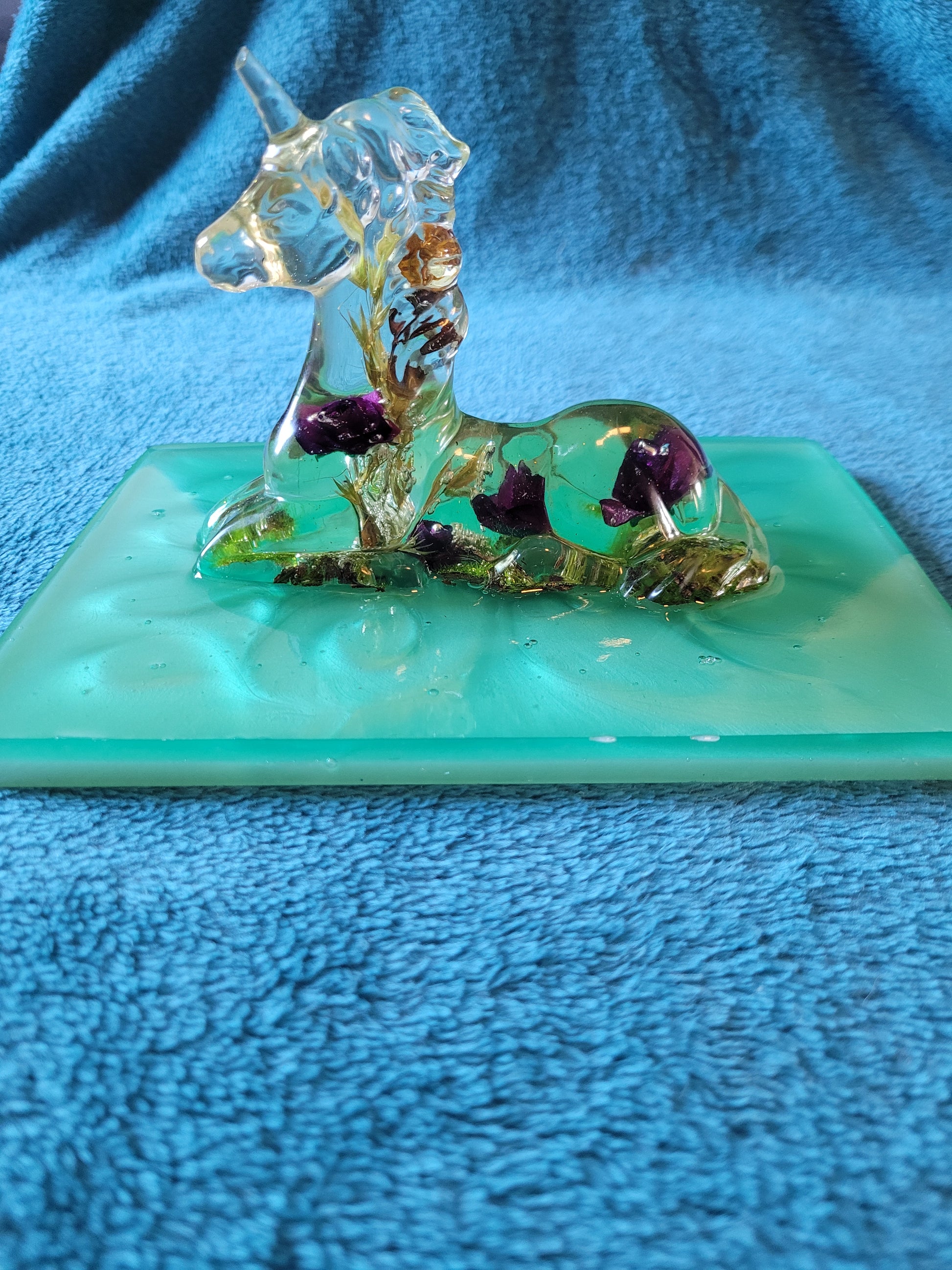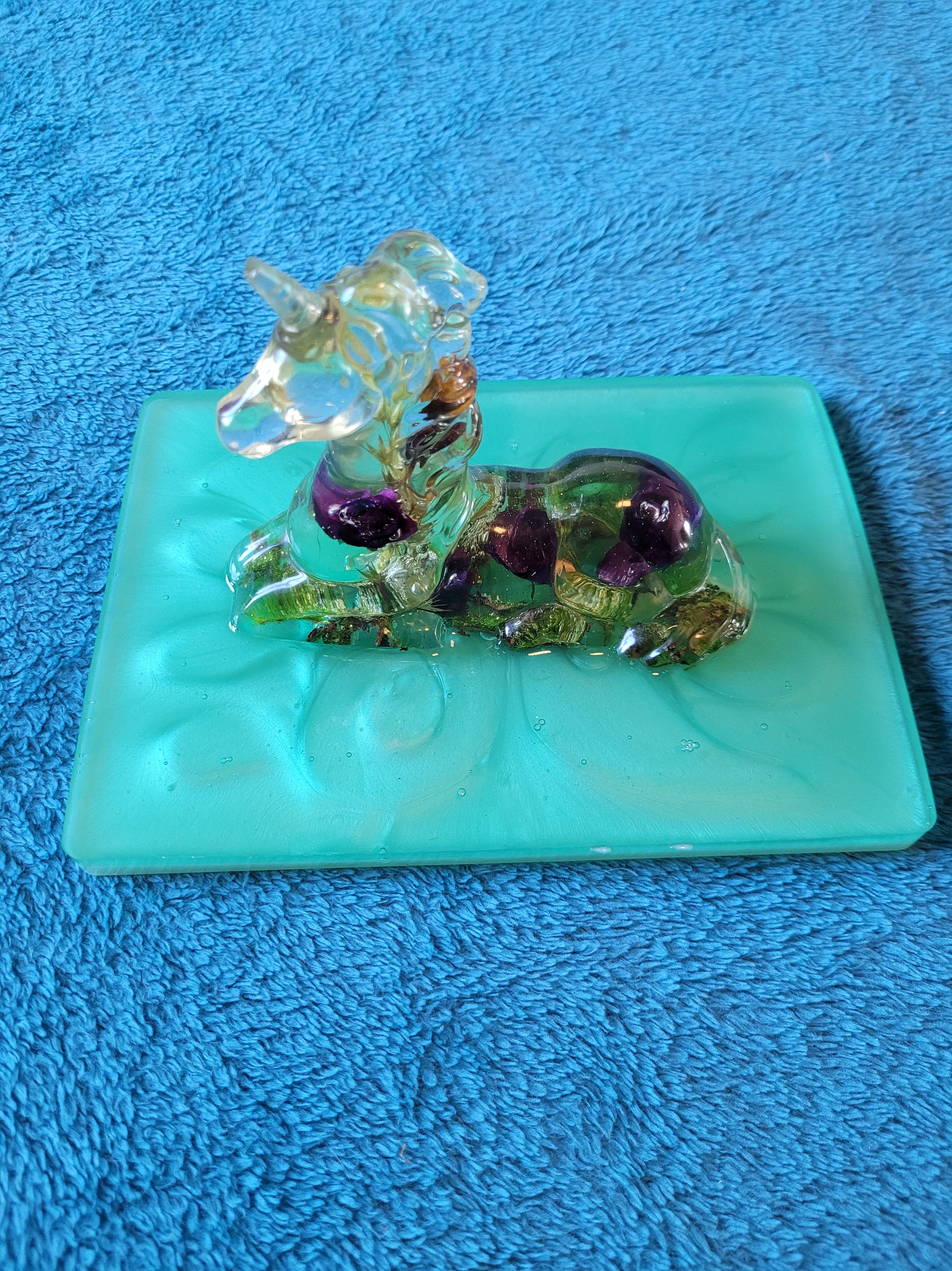 Jolie licorne florale sur son plateau, faite en résine epoxy.